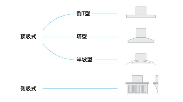 塔型和半坡型可以看做是倒 T 型的改版。塔型煙機改進出了更大的集煙腔,便于快速收集油煙,同等風量下,吸油煙效果比倒 T 型要好。