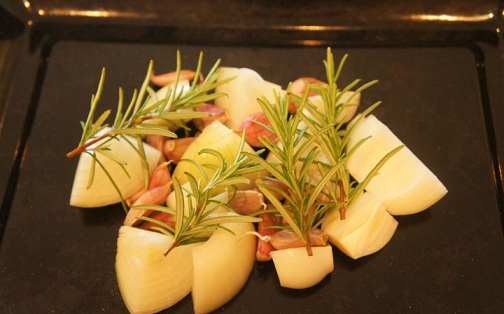 搞定洋蔥和蒜,表面洗干凈就好了,然后洋蔥切大塊,蒜掰成瓣,不需要去皮。再搞點新鮮迷迭香。